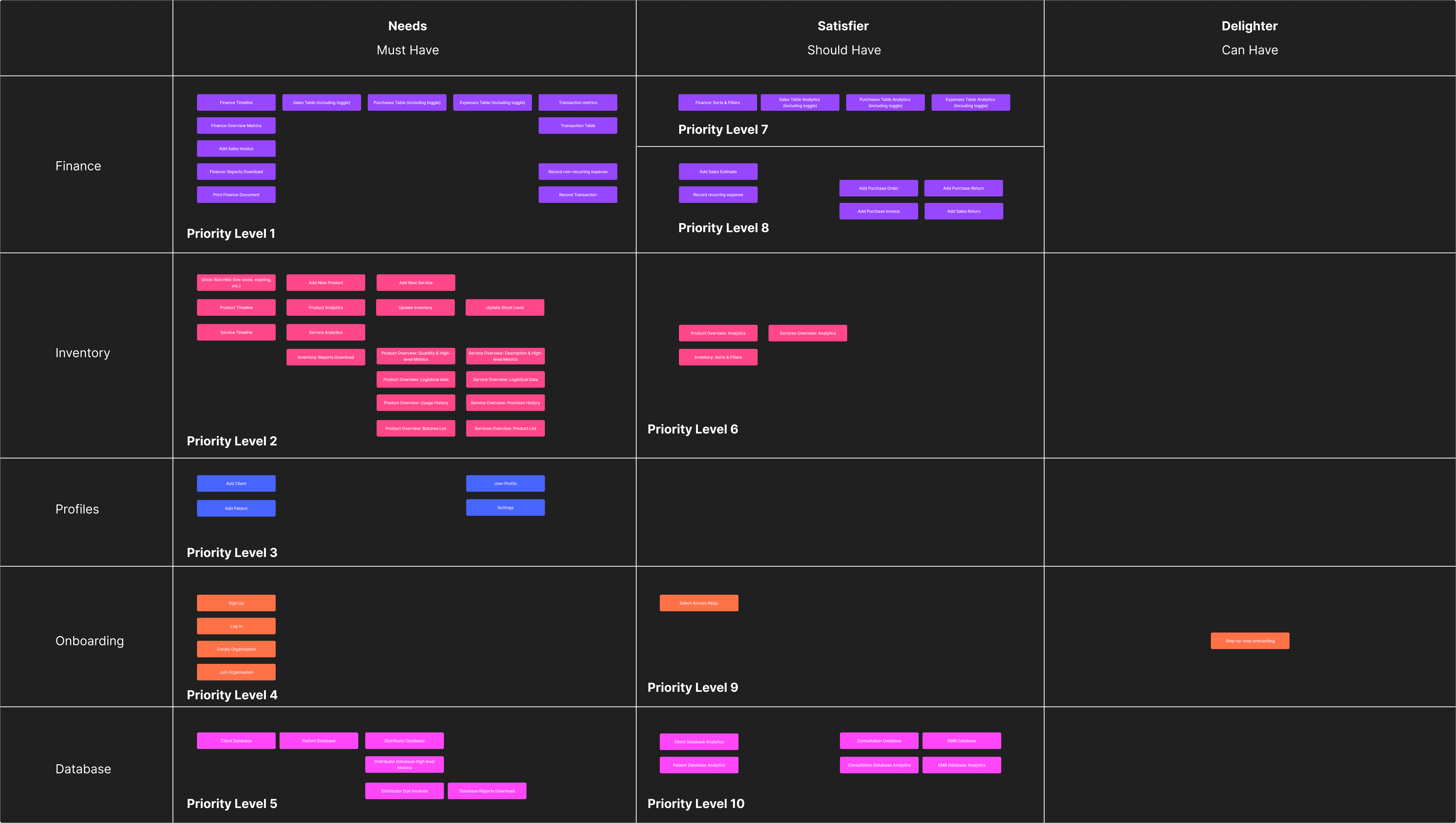 Prioritisation of key features via KANO analysis resulted in a roadmap dividing the product launch into the MVP, Version 1 and Version 2