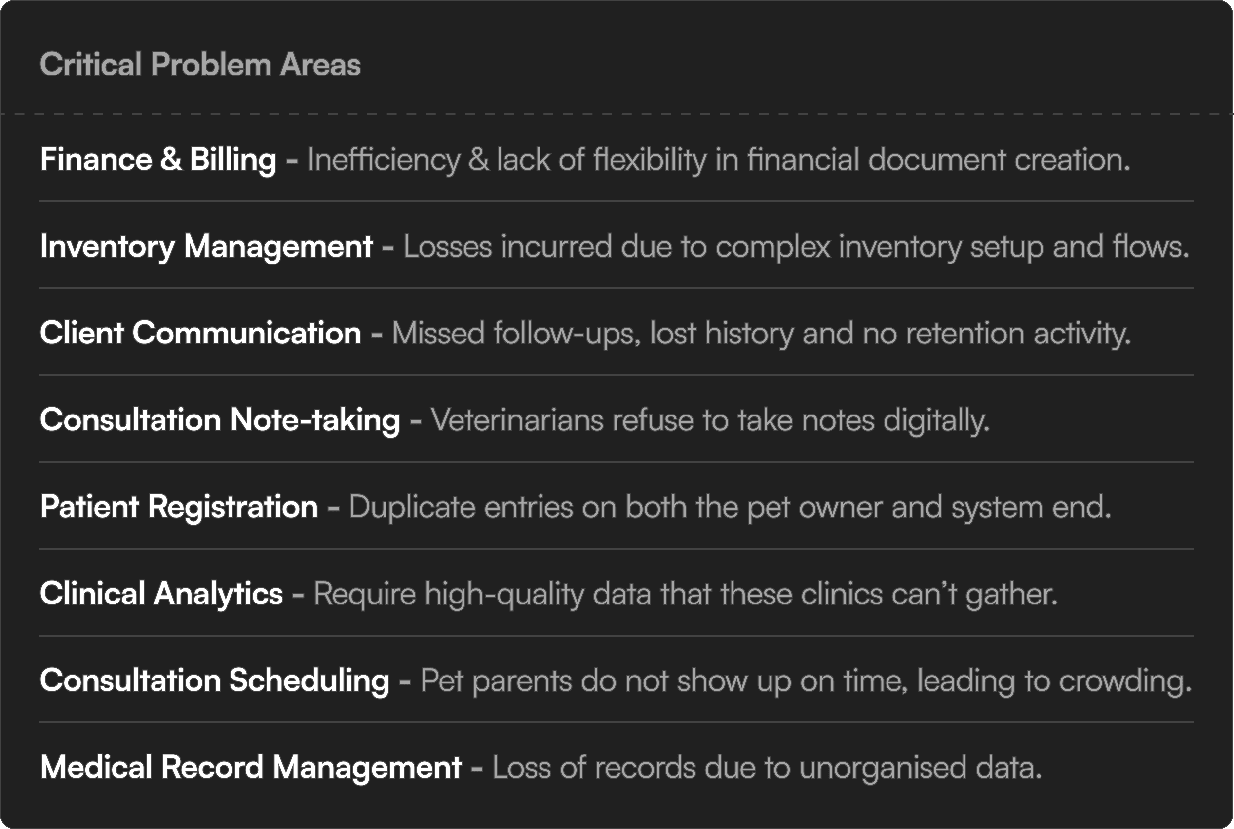This process illuminated the 8 core problem areas that veterinary clinics struggle with.