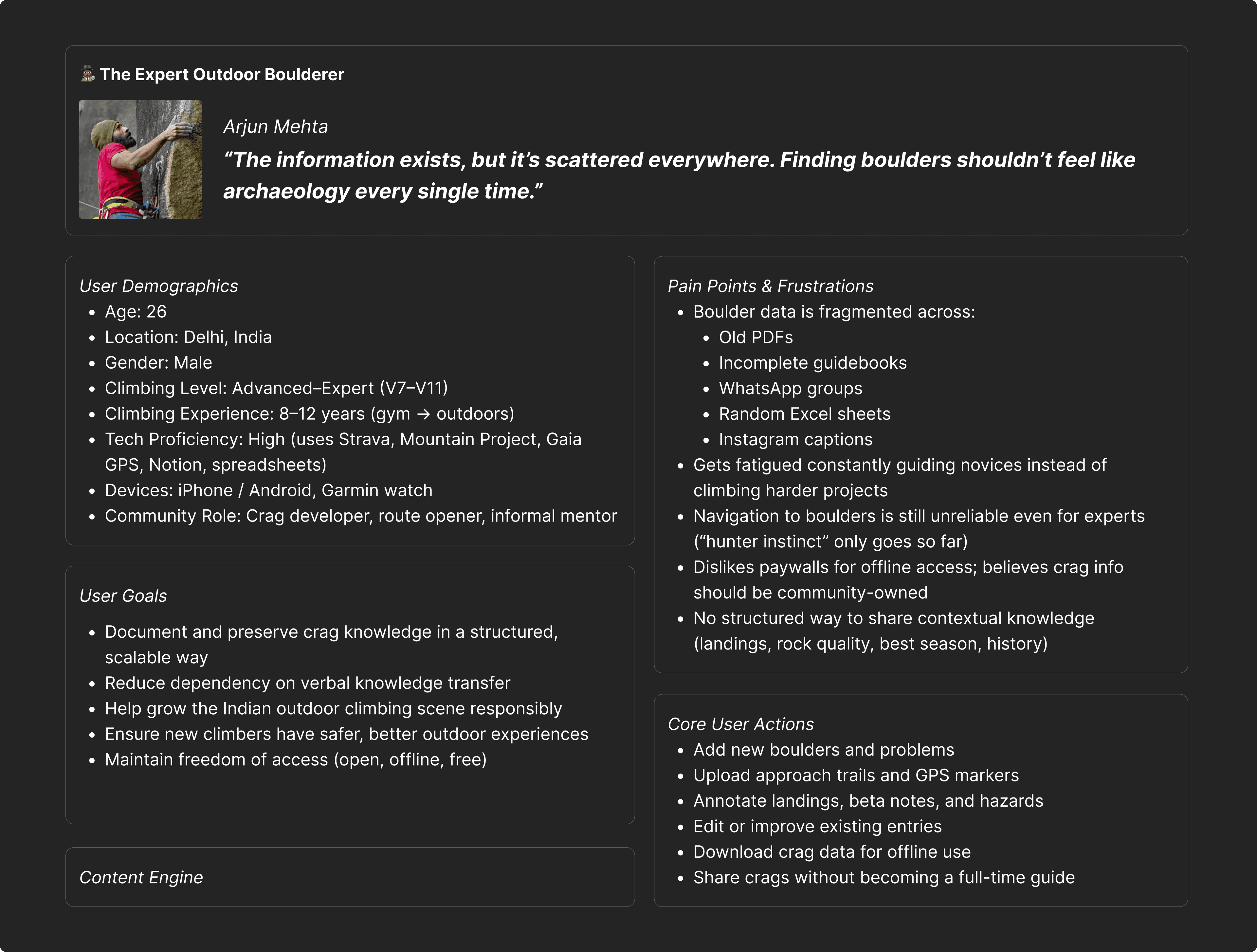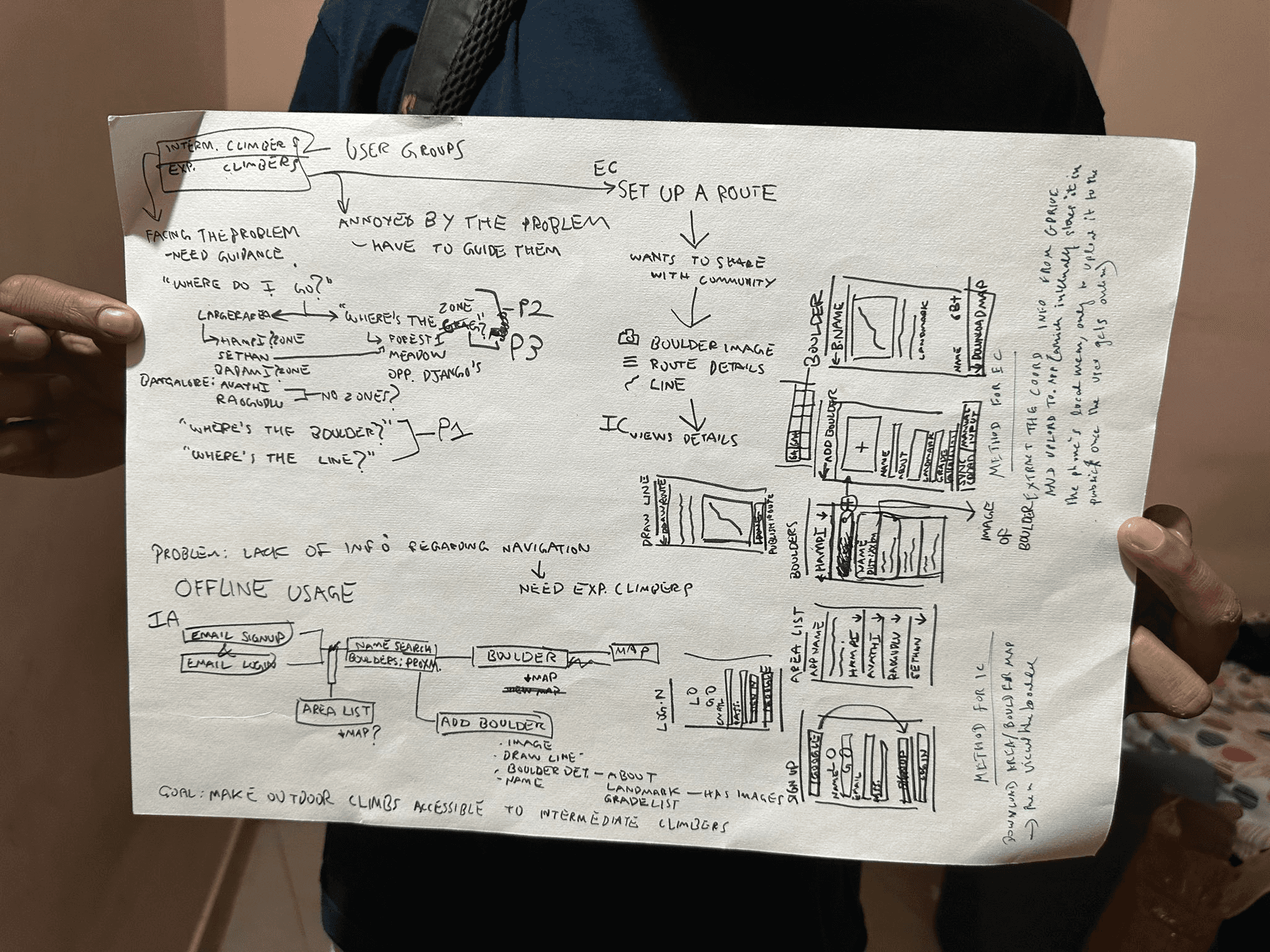 We began by validating the initial brief, I simply conversed with climbers at my local climbing gym, both intermediate indoor climbers who have expressed the desire to climb outdoors as well as avid outdoor climbers. This process made it clear that this was not a personal problem but a problem faced by the community at large.