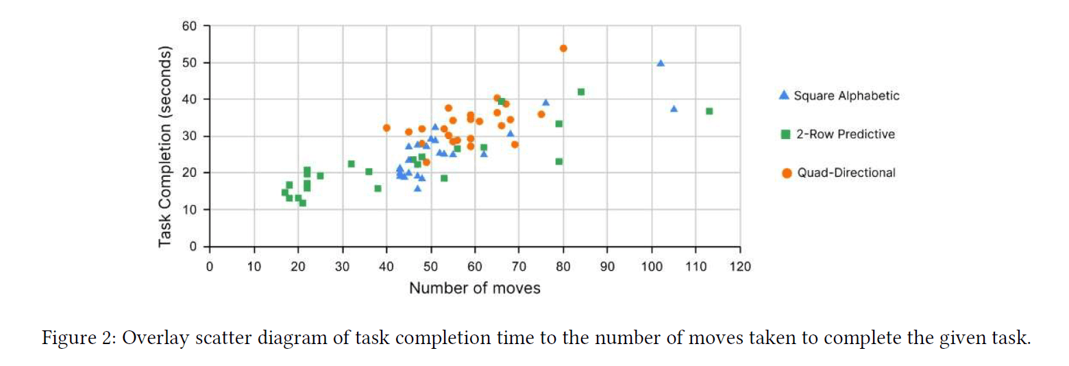 A one-way ANOVA was applied to the data. There were statistically significant differences between the means of the group as determined by the one-way ANOVA (F(2,69) = 4.18, p = 0.02). Pairwise comparisons show there was a significant difference between the 2-Row Predictive keyboard and the Quad-Directional keyboard (F(1,46) = 7.14, p = 0.01). There was no significant difference between the Square Alphabetic and Quad-Directional keyboard (F(1,46) = 0.98, p = 0.33) and between the Square Alphabetic and 2-Row Predictive keyboard (F(1,46) = 3.09; p= 0.09). These results indicate that the 2-Row Predictive (M = 43.58, SD = 26.04) keyboard performs better and requires less moves to complete the task than the Square Alphabetic (M = 54.75, SD = 17.08) and Quad-Directional (M = 58.71, SD= 9.53) keyboards, which perform similarly.