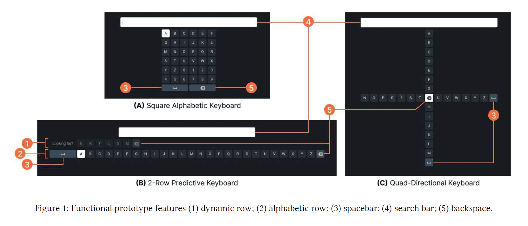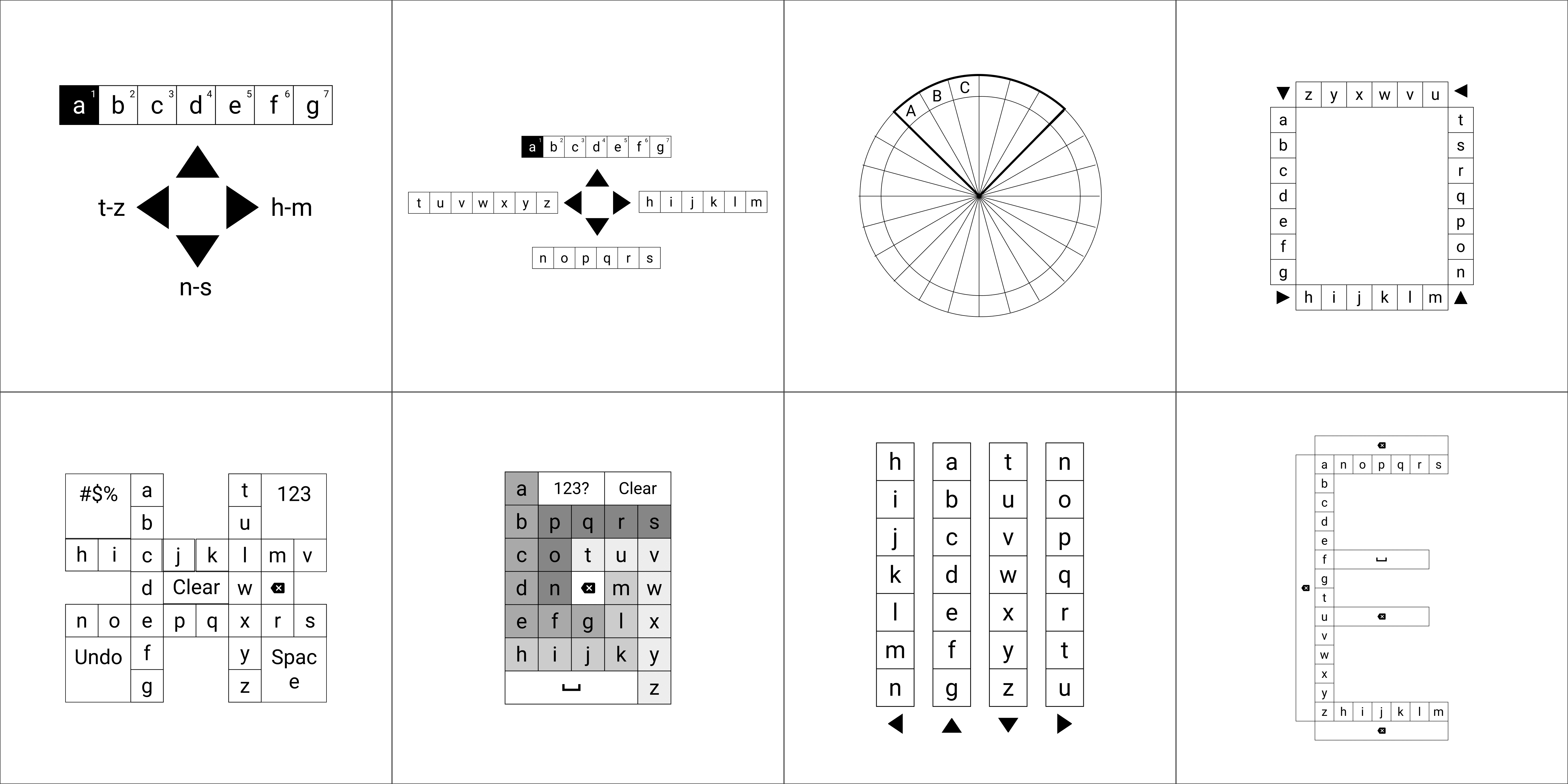 Concepts for the two novel text input methods have been limited to 2D on-screen keyboards controlled via a remote control with four directional buttons (left, right, up, and down) and a selection key at the center. Functional prototypes of the three keyboards were developed using HTML5, CSS, and JavaScript