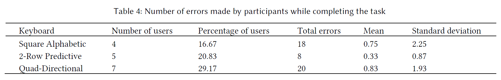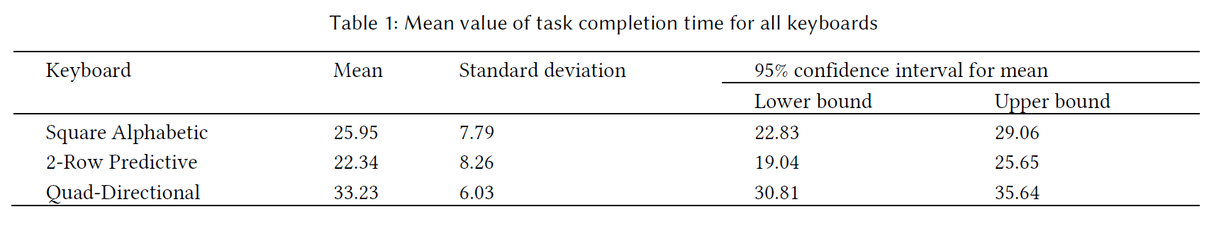 A one-way ANOVA test showed significant differences between the means of the group as determined by the one-way ANOVA (F(2,69) = 13.39, p < 0.001). Pairwise comparisons show that there was a significant difference between the mean task completion time of the Square Alphabetic keyboard and the Quad-Directional keyboard (F(1,46) = 13.11; p < 0.001). There was a significant difference between the mean task completion times of the 2-Row Predictive and Quad-Directional keyboards (F(1,46) = 27.15, p < 0.001) as well. However, there was no significant difference between Square Alphabetic and 2-Row Predictive (F(1,46) = 2.41, p = 0.13). These results indicate that the Square Alphabetic (M = 25.95, SD = 7.79) and 2-Row Predictive (M = 22.34, SD = 8.26) keyboards perform similarly and require less time for task completion than the Quad-Directional (M = 33.23, SD = 6.03) keyboard.
