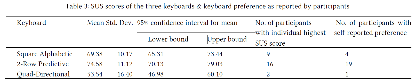 A one-way ANOVA was applied to the data. There were statistically significant differences between group means as determined by the one-way ANOVA (F(2,69) = 17.43, p < 0.001). Pairwise comparisons show that there was a significant difference between the Square Alphabetic and Quad-Directional keyboard (F(1,46) = 17.41; p < 0.001) and between the 2-Row Predictive keyboard and Quad-Directional keyboard (F(1,46) = 27.06, p < 0.001). There was no significant difference between the Square Alphabetic and 2-Row Predictive keyboards (F(1,46) = 2.87, p = 0.1). The Square Alphabetic (M = 69.38, SD = 10.17) and 2-Row Predictive keyboards (M = 74.58, SD = 11.12) have a score above 68, indicating that they are considered to be above average. In contrast, the Quad-Directional keyboard (M = 53.54, SD = 16.40) is considered below average.