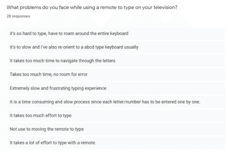 Their first impressions regarding the 2-Row Predictive keyboard, seemed "tedious" or "lengthy," involving lots of button presses to reach their target character. They were also concerned about being unable to see all characters at once. Post usage, they were satisfied with the experience and stated that they typed a lot faster by using the dynamic row and found the predicted characters to be accurate. Some participants were concerned about the accuracy while searching for lesser-known movie titles as they were not enthusiastic about shifting between the two rows of the keyboard.