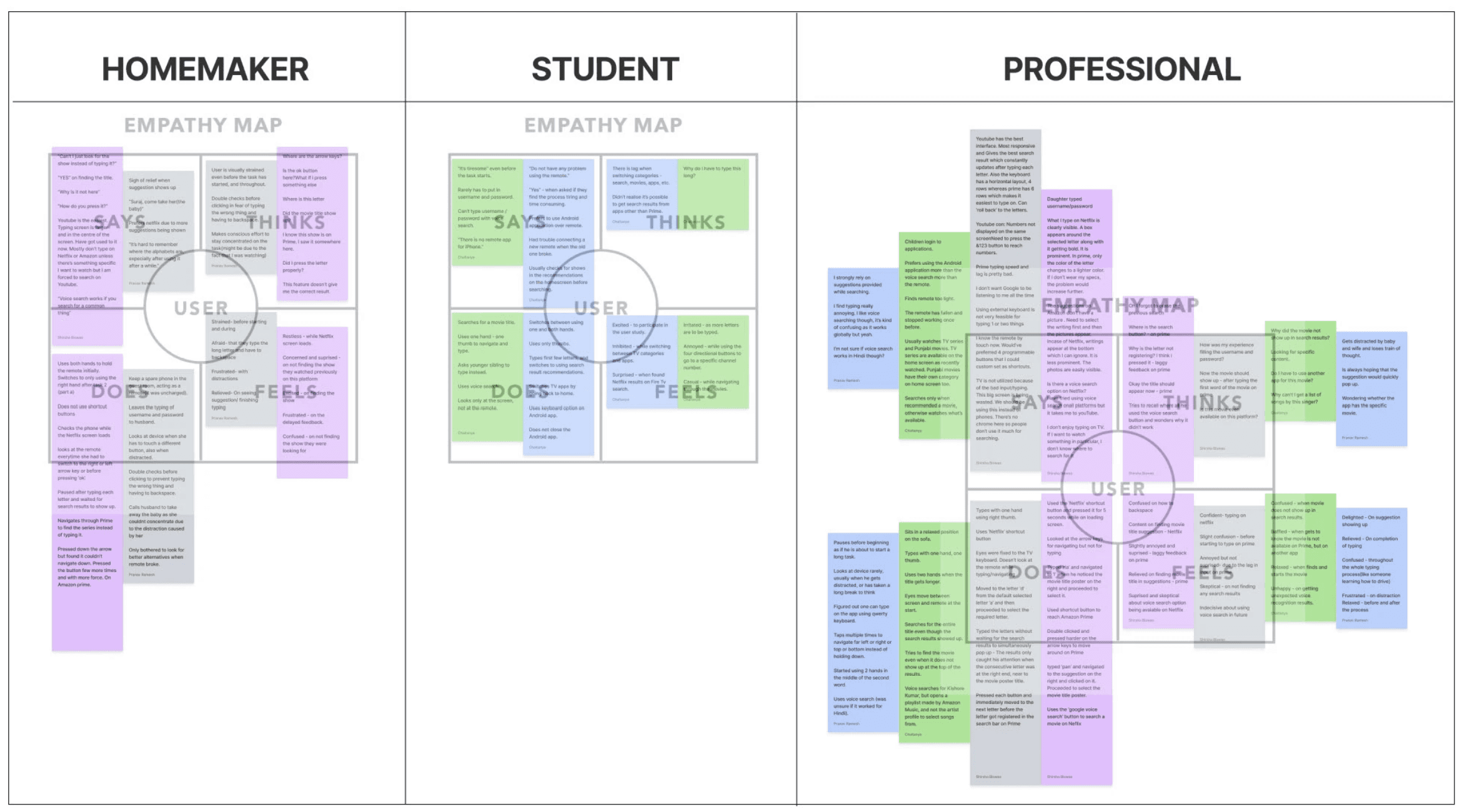 We identified 3 user groups based on their experience with technology and created empathy maps based on data gathered from the study to arrive at key insights and opportunity areas.